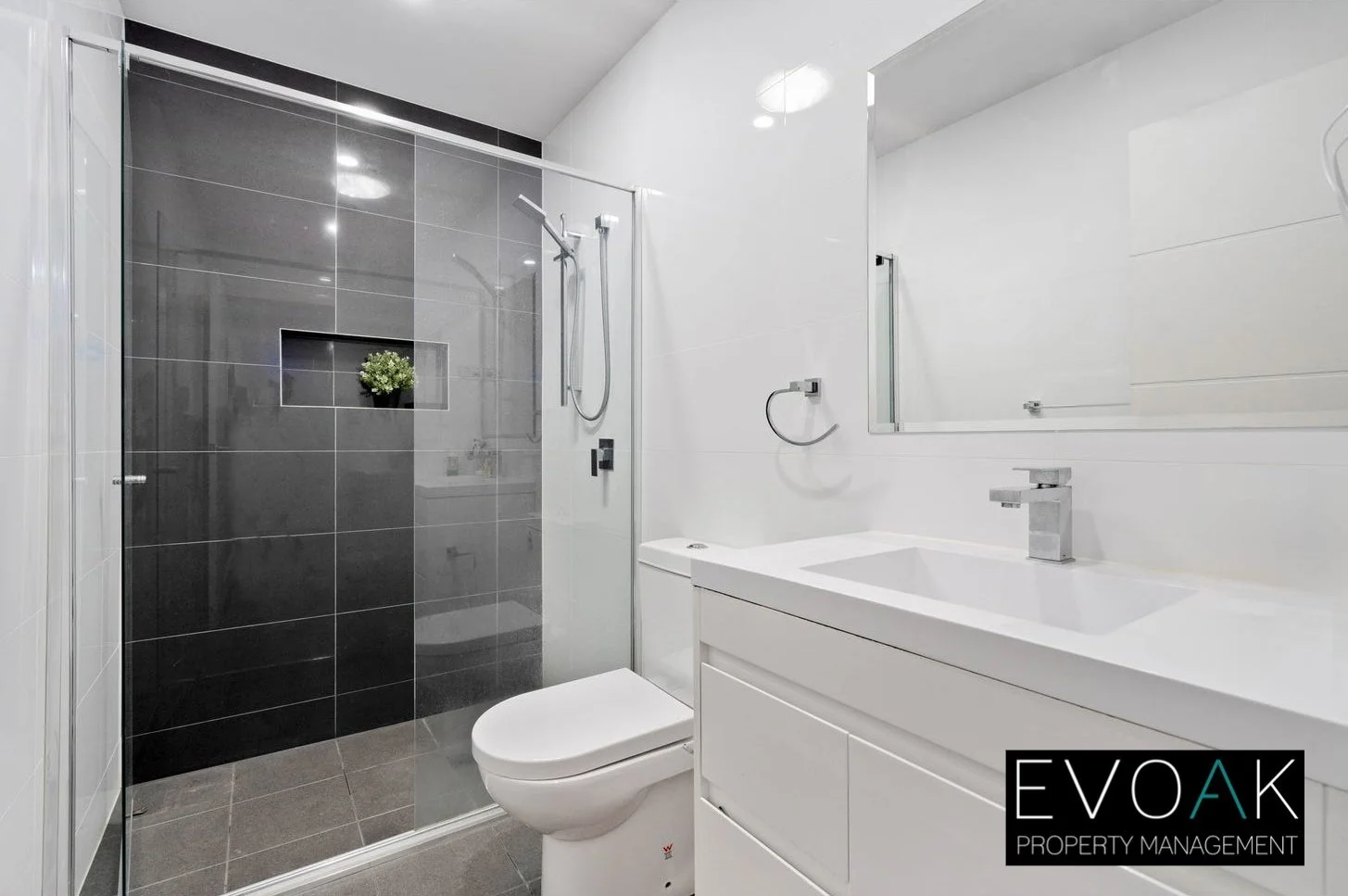 -Main bathroom with frameless glass shower screen, shaving cabinet and skylight.